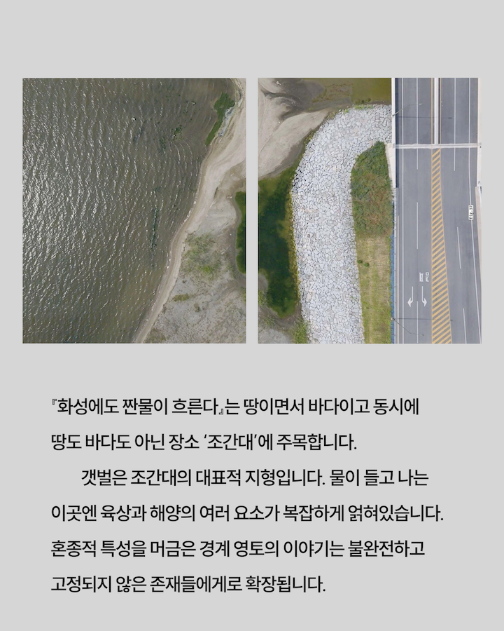 『화성에도 짠물이 흐른다』는 땅이면서 바다이고 동시에 땅도 바다도 아닌 장소 ‘조간대’에 주목합니다. 갯벌은 조간대의 대표적 지형입니다. 물이 들고 나는 이곳엔 육상과 해양의 여러 요소가 복잡하게 얽혀있습니다. 혼종적 특성을 머금은 경계 영토의 이야기는 불완전하고 고정되지 않은 존재들에게로 확장됩니다.
