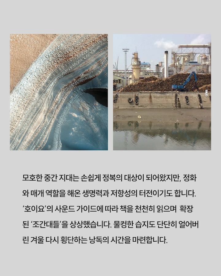 모호한 중간 지대는 손쉽게 정복의 대상이 되어왔지만, 정화와 매개를 역할을 해온 생명력과 저항성의 터전이기도 합니다. ‘호이요’의 사운드 가이드에 따라 책을 천천히 읽으며 확장된 ‘조간대들’을 상상했습니다. 물컹한 습지도 단단히 얼어버린 겨울 다시 횡단하는 낭독의 시간을 마련합니다.