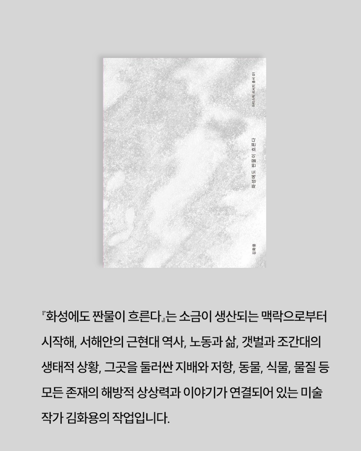 『화성에도 짠물이 흐른다』는 소금이 생산되는 맥락으로부터 시작해, 서해안의 근현대 역사, 노동과 삶, 갯벌과 조간대의 생태적 상황, 그곳을 둘러싼 지배와 저항, 동물, 식물, 물질 등 모든 존재의 해방적 상상력과 이야기가 연결되어 있는 미술작가 김화용의 작업입니다.
