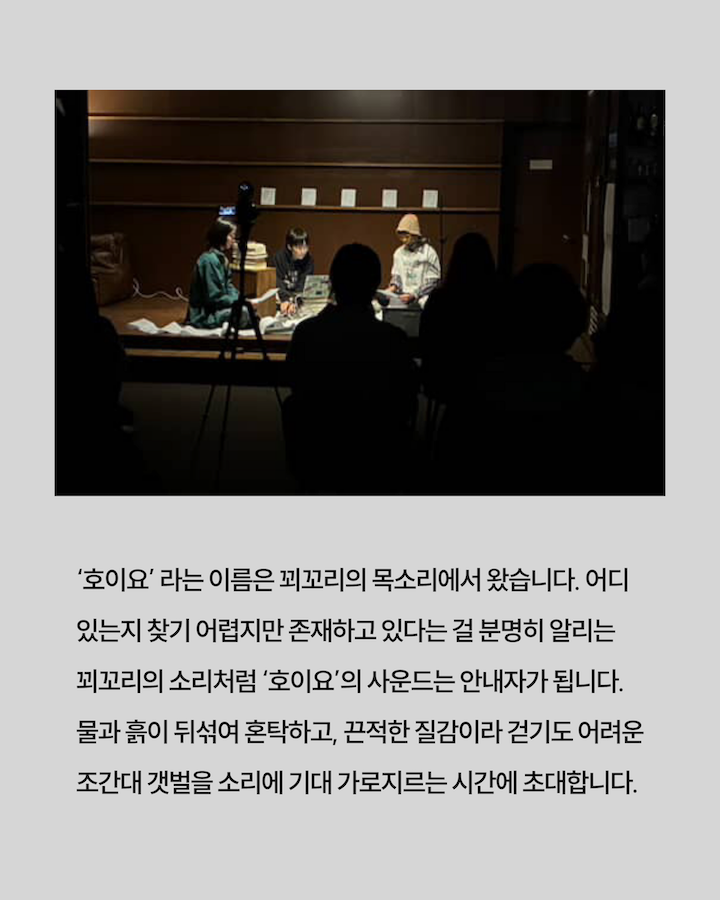 ‘호이요’ 라는 이름은 꾀꼬리의 목소리에서 왔습니다. 어디 있는지 찾기 어렵지만 존재하고 있다는 걸 분명히 알리는 꾀꼬리의 소리처럼 ‘호이요’의 사운드는 안내자가 됩니다. 물과 흙이 뒤섞여 혼탁하고, 끈적한 질감이라 걷기도 어려운 조간대 갯벌을 소리에 기대 가로지르는 시간에 초대합니다.