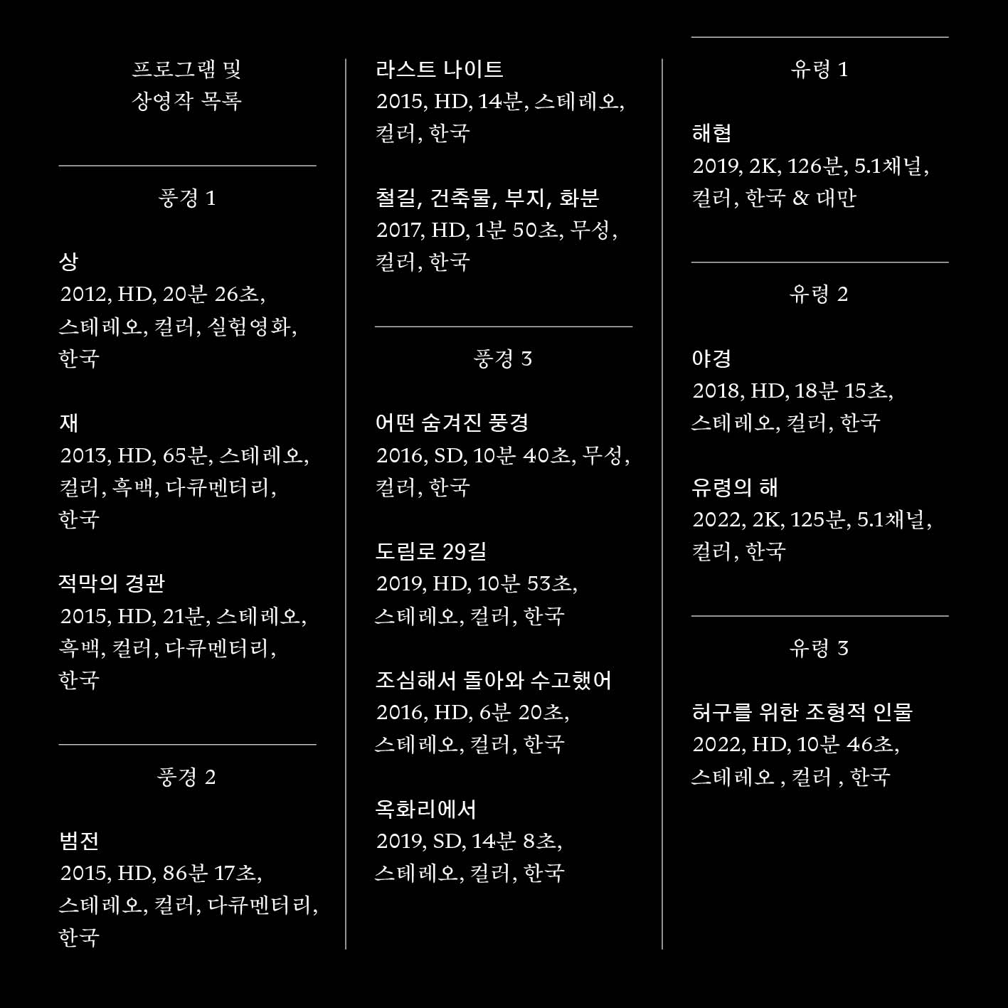 풍경을 지켜보던 사람들이 있었다. 풍경이 흔들려 사라지는 그만큼 몇몇은 흩어졌고 몇몇은 풍경을 떼어내 침묵시켰으며 몇몇은 스스로 풍경이 되고자 그 속으로 들어갔다. 풍경을 지켜보는 사람으로 남은 이들은 드물다. 오민욱은 그 드문 사람 중 하나다. 보다 세심히 말해보자면, 그는 가시적인 풍경을 통해 우리와 풍경 사이에 놓인 무언가를 지켜봤고 그것이 무엇인지 궁금해했다. 어떤 이들은 그 무언가를 지켜봤고 그것이 무엇인지 궁금해했다. 어떤 이들은 그 무언가를 ‘역사’라고 말하기도 하지만, 역사 또한 풍경에 언뜻언뜻 비치는 가시성일 뿐 오민욱이 바라보는 시간의 덩어리, 즉 켜켜이 쌓여 끊임없는 진동을 불러일으키는 흐릿한 것에 대해서 말하기에는 불충분하다. 풍경이 흔들려 사라지는 그만큼 우리와 풍경 사이에 놓인 무언가 또한 끊임없이 흐른다. 영화가 그 흐름을 추측한다 하더라도 영화로서는 그 흐름을 멈추지는 못하기 때문에 오민욱은 어떤 장소를 방문하고 다시 방문한다. 다르게 말하면 그는 풍경을 지켜보는 사람이기도 하지만 그만큼 그 땅의 여진을 따라 걸어왔다고도 할 수 있을 것이다. 그러던 그가 언젠가부터 자신의 영화에 텅 빈 어떤 공간 혹은 어둠의 자리를 마련하기 시작한다. 그리고 그 공간에 무엇이든 될 수 있을 것만 같고 무엇이라고 할 수 있을 만한 어떤 형상을 세운다. 그 공간과 형상을 포함하는 시간은 오민욱이 지켜보던 진동 그 자체와도 닮아 있는 것 같지만, 그것을 무어라고 말하기는 쉽지 않기에 일단 유령이라고 불러 보기로 한다.