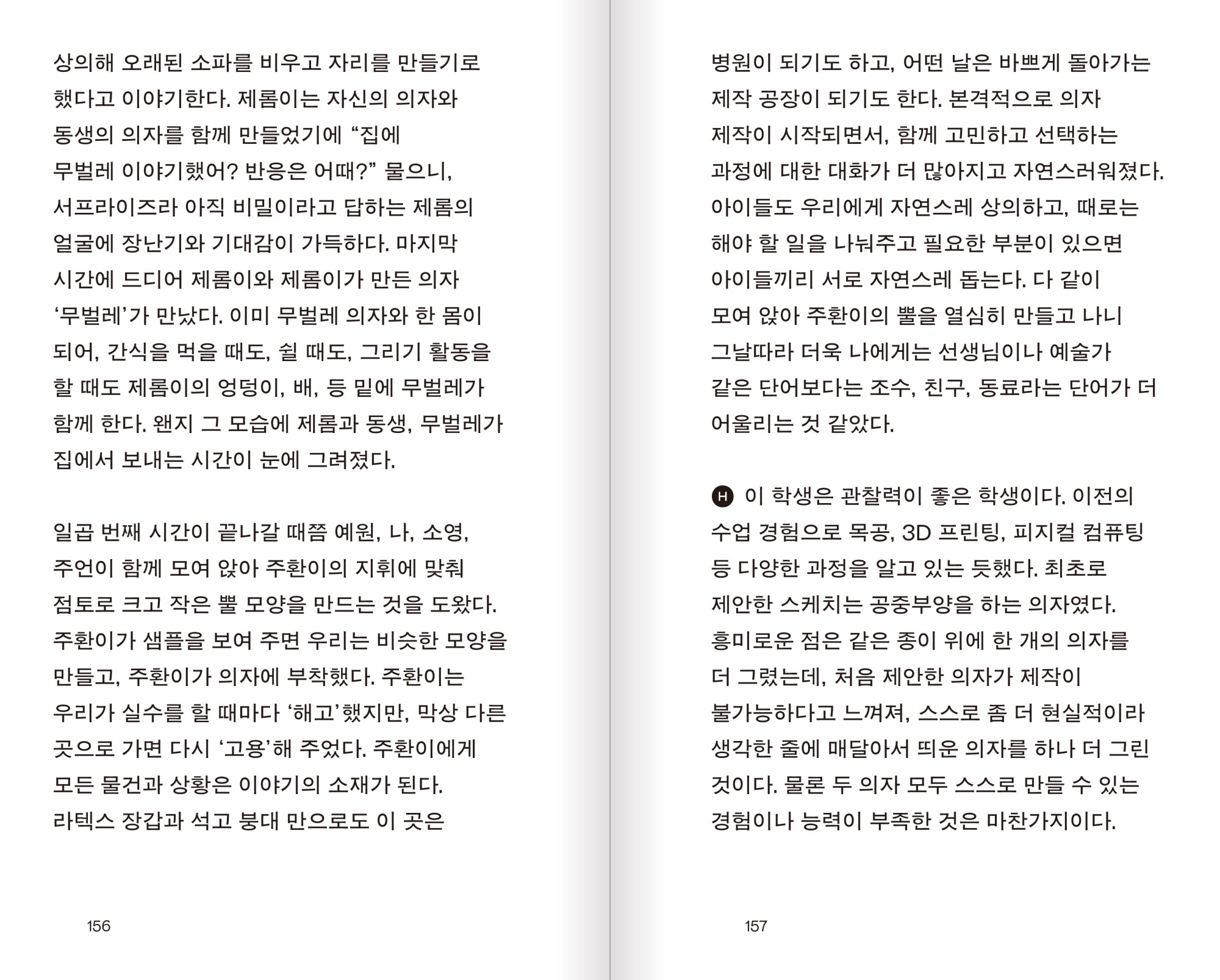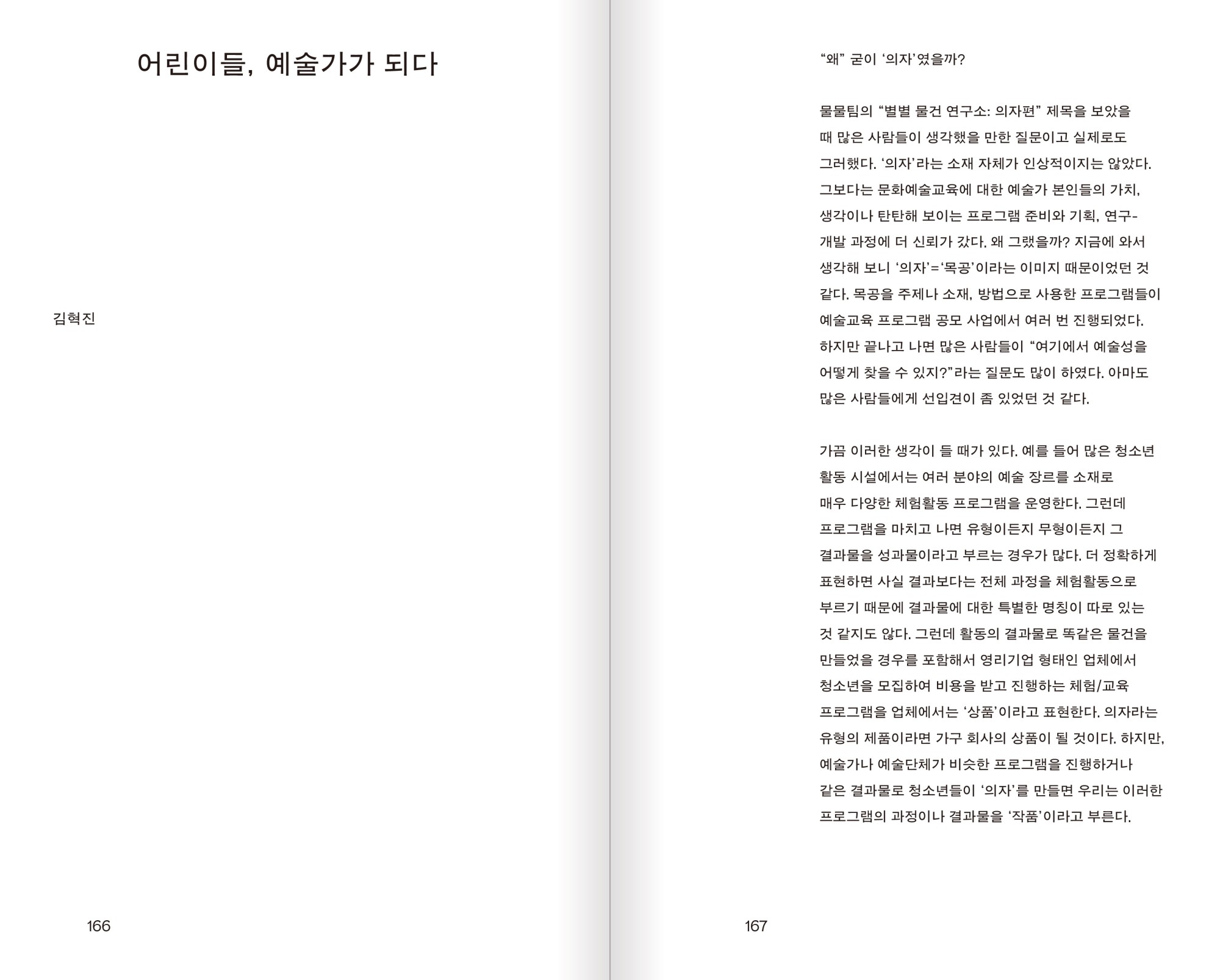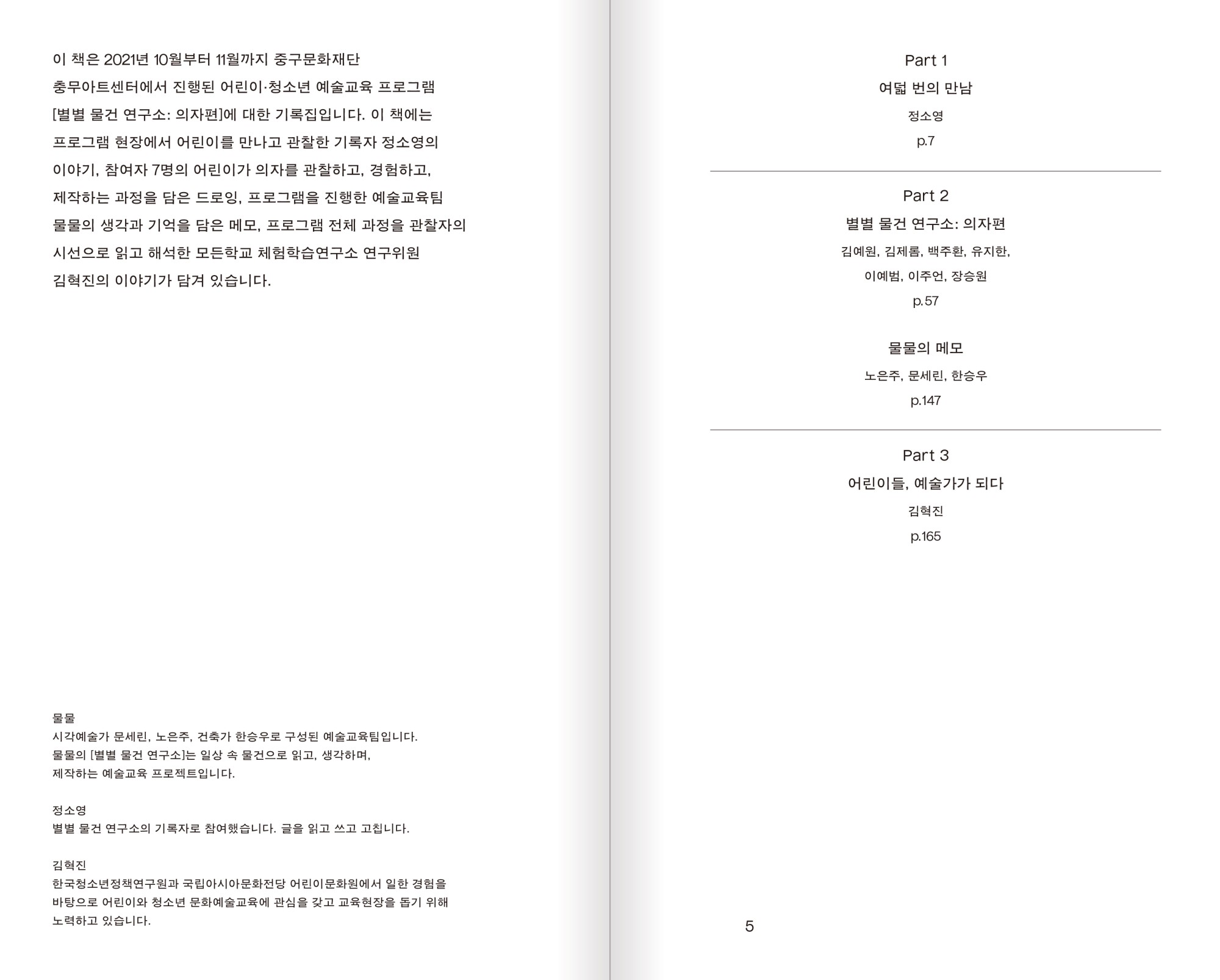이 책은 2021년 10월부터 11월까지 중구문화재단 충무아트센터에서 진행된 어린이·청소년 예술교육 프로그램 [별별 물건 연구소: 의자편]에 대한 기록집입니다. 이 책에는 프로그램 현장에서 어린이를 만나고 관찰한 기록자 정소영의 이야기, 프로그램에 참여한 7명의 어린이가 의자를 관찰하고, 경험하고, 제작하는 과정을 담은 드로잉, 프로그램을 진행한 예술교육팀 물물의 생각과 기억을 담은 메모, 프로그램 전체 과정을 관찰자의 시선으로 읽고 해석한 모든학교 체험학습연구소 연구위원 김혁진의 이야기가 담겨 있습니다.