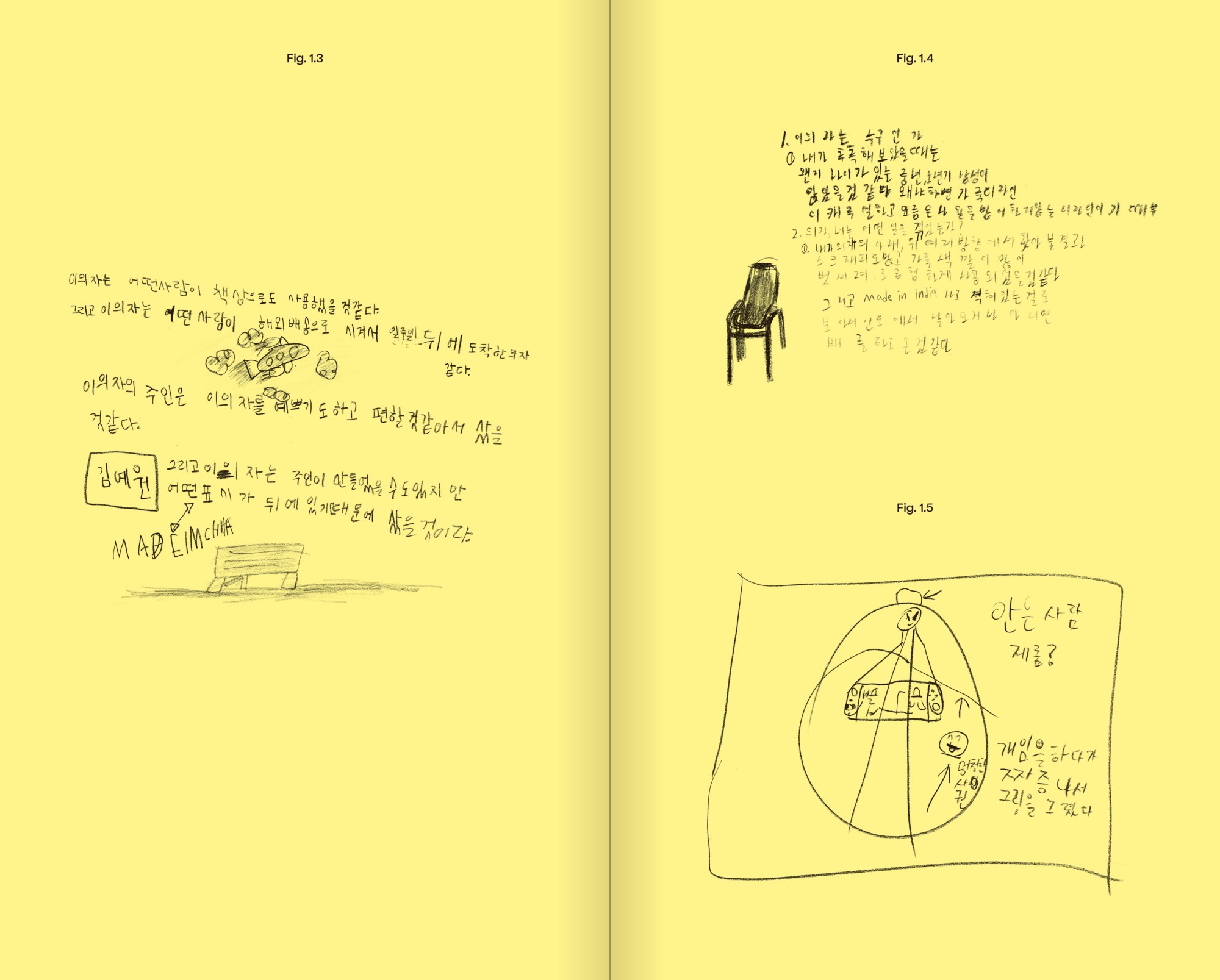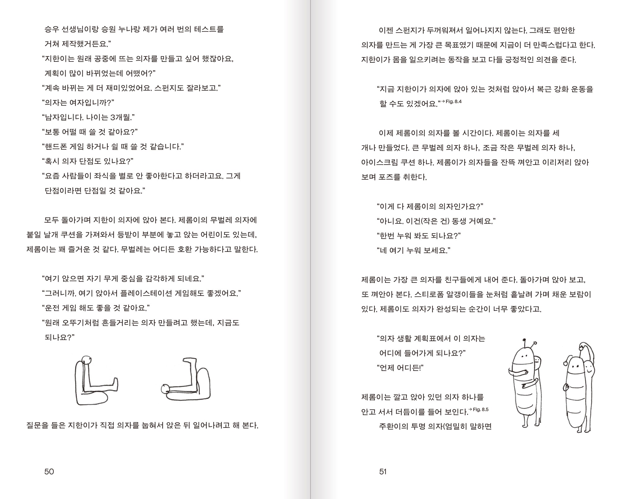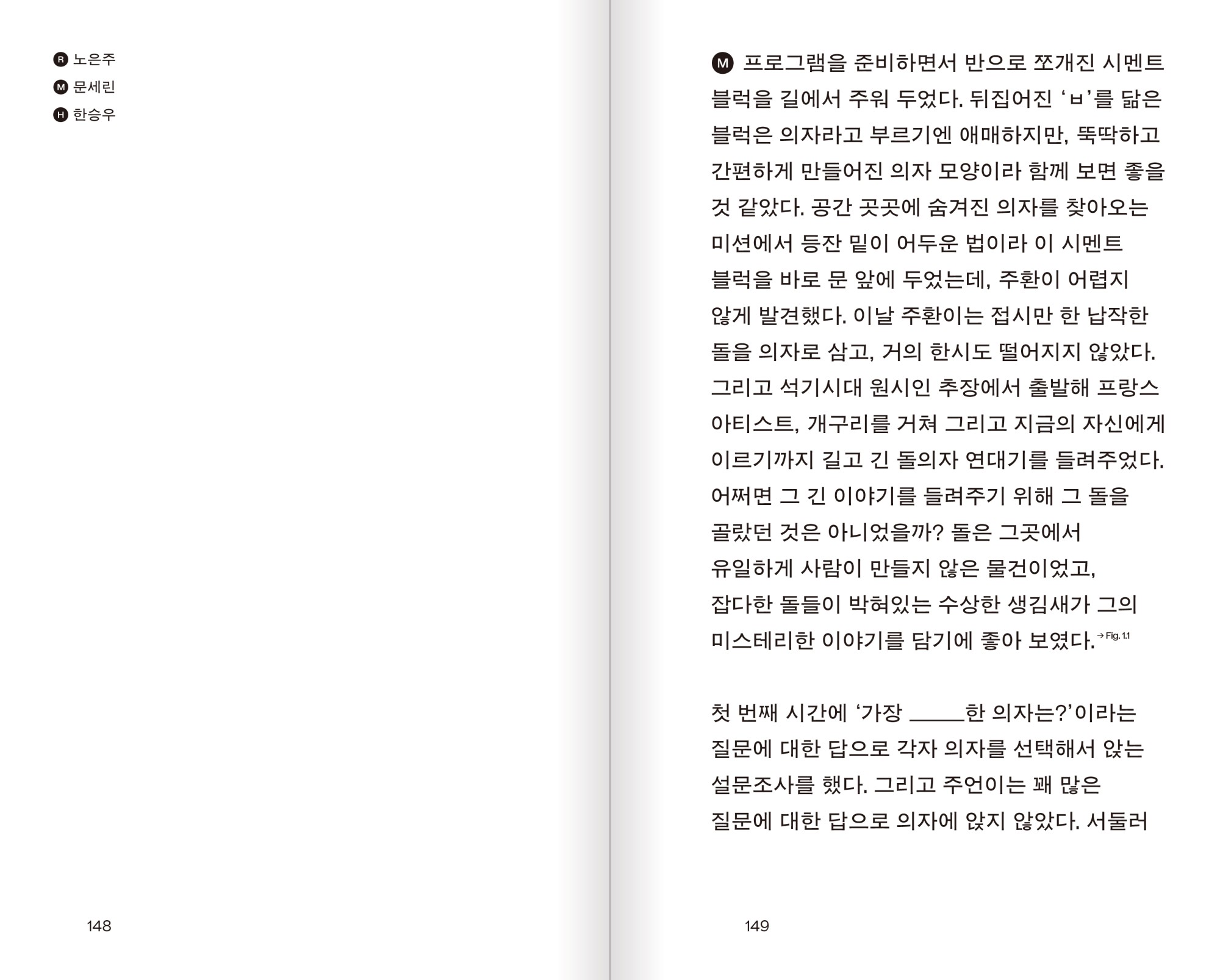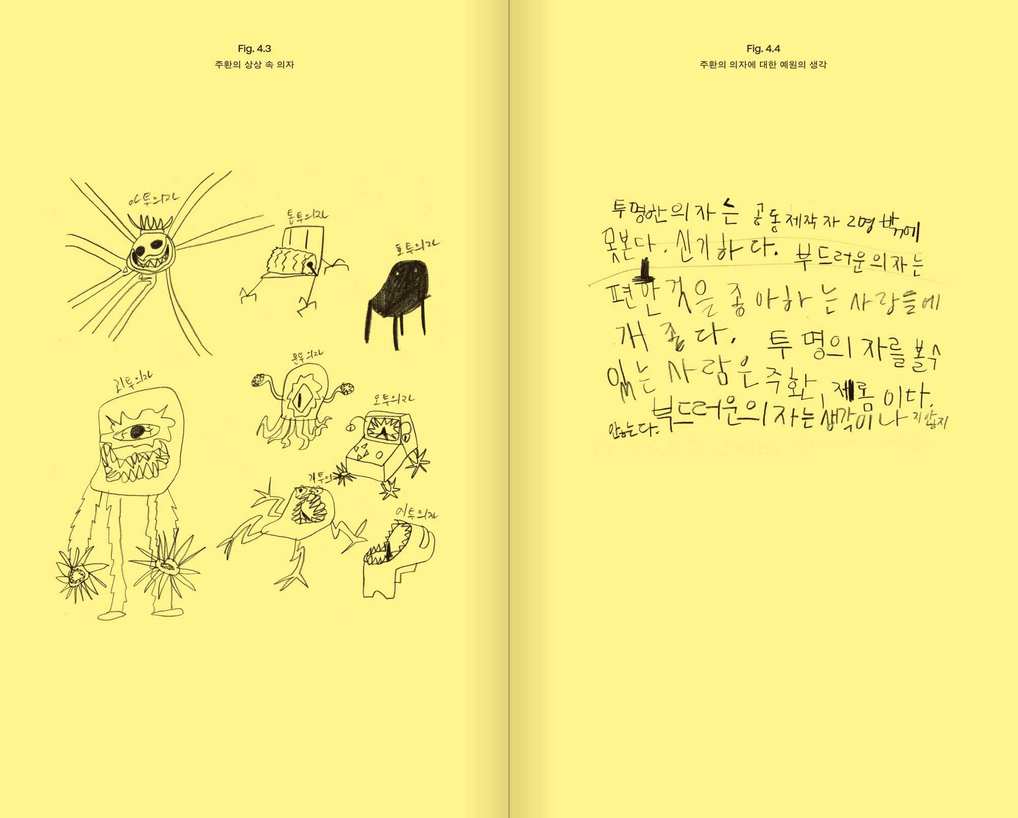 이 책은 2021년 10월부터 11월까지 중구문화재단 충무아트센터에서 진행된 어린이·청소년 예술교육 프로그램 [별별 물건 연구소: 의자편]에 대한 기록집입니다. 이 책에는 프로그램 현장에서 어린이를 만나고 관찰한 기록자 정소영의 이야기, 프로그램에 참여한 7명의 어린이가 의자를 관찰하고, 경험하고, 제작하는 과정을 담은 드로잉, 프로그램을 진행한 예술교육팀 물물의 생각과 기억을 담은 메모, 프로그램 전체 과정을 관찰자의 시선으로 읽고 해석한 모든학교 체험학습연구소 연구위원 김혁진의 이야기가 담겨 있습니다.
