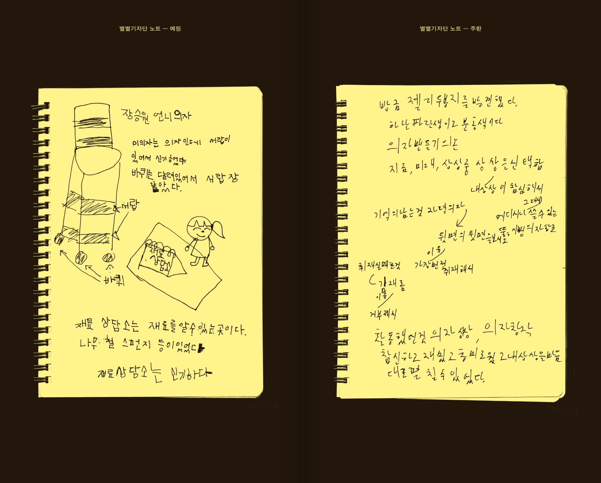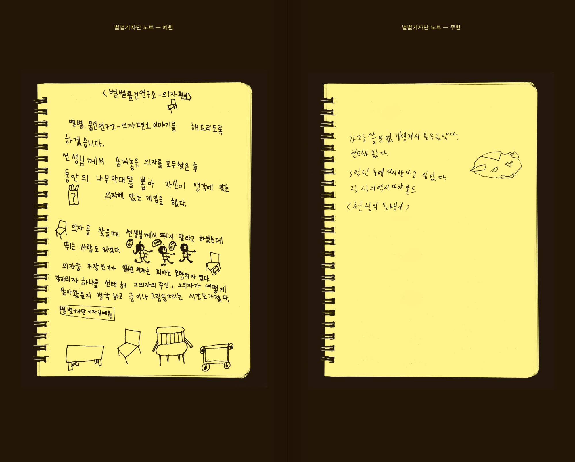시각예술가 문세린, 노은주, 건축가 한승우로 구성된 예술교육팀입니다. 물물의 [별별 물건 연구소]는 일상 속 물건으로 읽고, 생각하며, 제작하는 예술교육 프로젝트입니다.