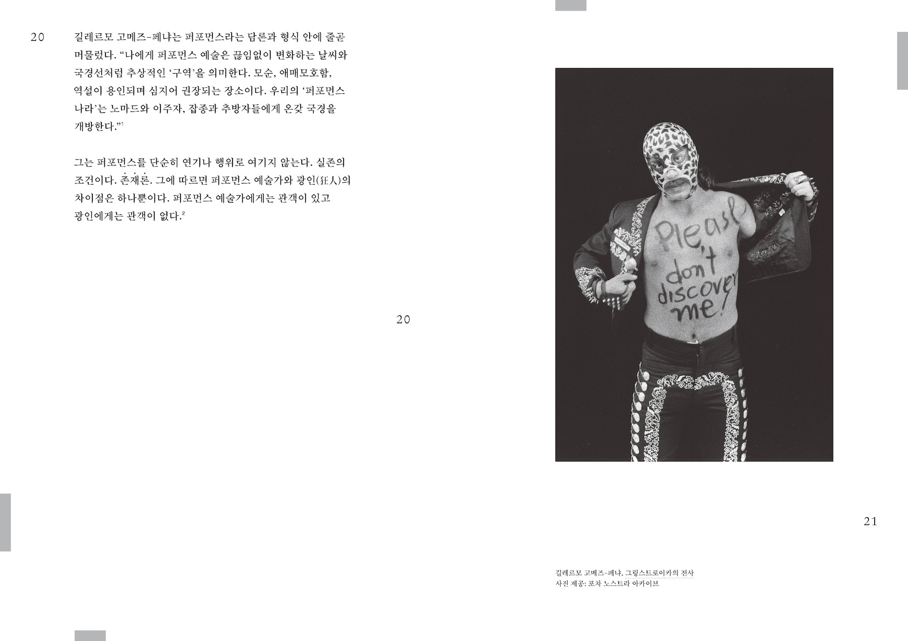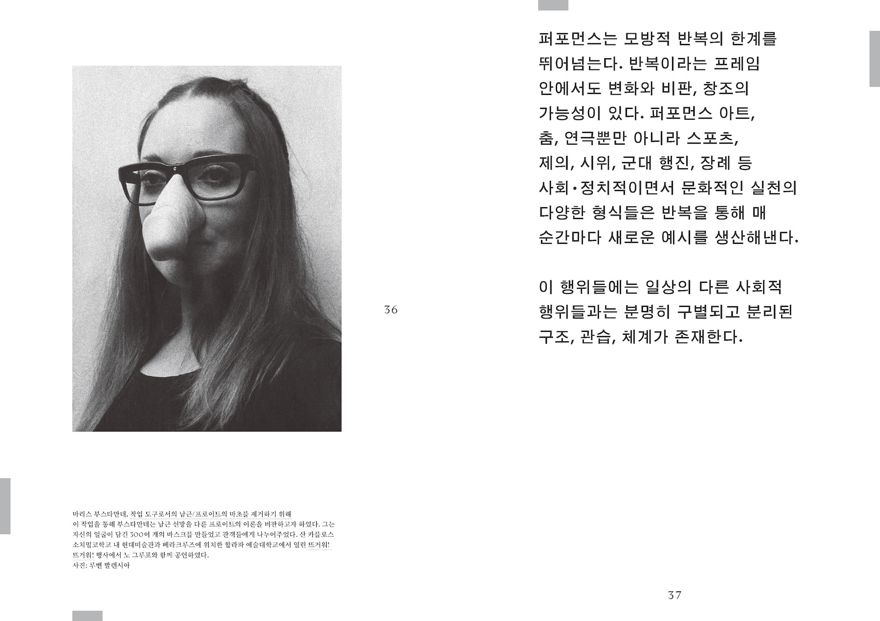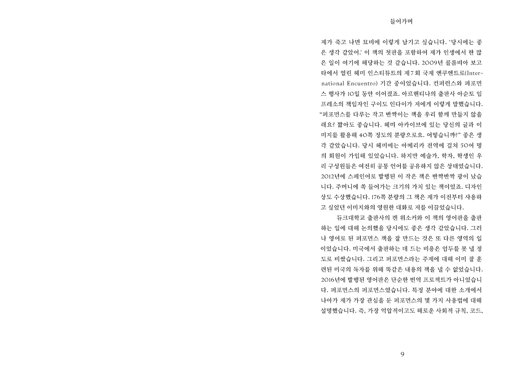 이 책에 등장하는 수많은 작가들과 퍼포먼스 작업이 아메리카, 특히 라틴 아메리카 지역에 집중되어 있는 것은 우연이 아니다. 다이애나 테일러는 1998년 설립된 헤미스퍼릭 인스티튜의 창립자 중 한 명으로, 이 기관은 아메리카 지역의 퍼포먼스를 연구하고 이에 관해 대화하는 급진적인 장소이다. 테일러는 헤미 인스티튜트 아카이브의 자료와 자신의 학자행동가(activist-academics)로서의 활동 경험을 바탕으로 이 책을 썼다. 서로 다른 지리적, 문화적, 정치적, 사회적 조건을 가지고 있으며 서로 다른 언어를 사용하는 이들과의 대화를 통해, 저자는 퍼포먼스가 근본적으로 얼마나 불안정하고 유동적인지를, 그리고 동시에 경계과 구분을 넘어서는 힘을 가지고 있는지를 이론화하게 된 것이다. 이 책이 우리에게 알려 주는 것은 아메리카라는 대상이 아니다. 그보다는 특정 지역의 사회와 문화가 어떻게 그 현실적 조건을 수용하고 또 비판하며 퍼포먼스를 수행하는가 이다. 여기에는 어떤 지역과 장소의 정체성은 퍼포먼스에 의해, 그러니까 끊임없이 움직이고 흐르는 행동들로 구성되고 재구성된다는 것이 전제되어 있을 것이다. 이는 자연스럽게, 그렇다면 우리를 둘러싼 현실적 조건은 무엇이며 우리는 여기서 무엇을 수행해야 하고 할 수 있는지를 묻게 한다.