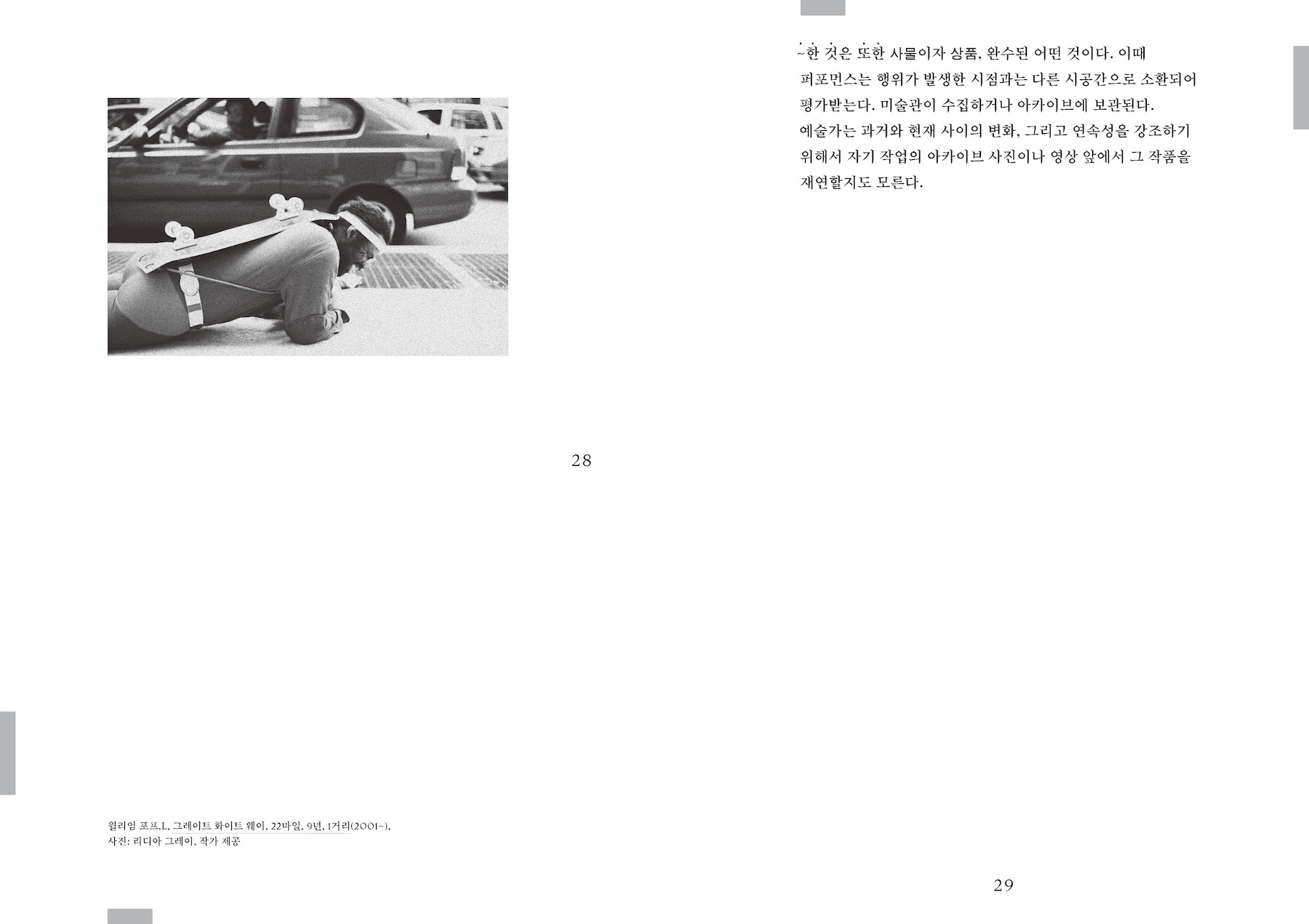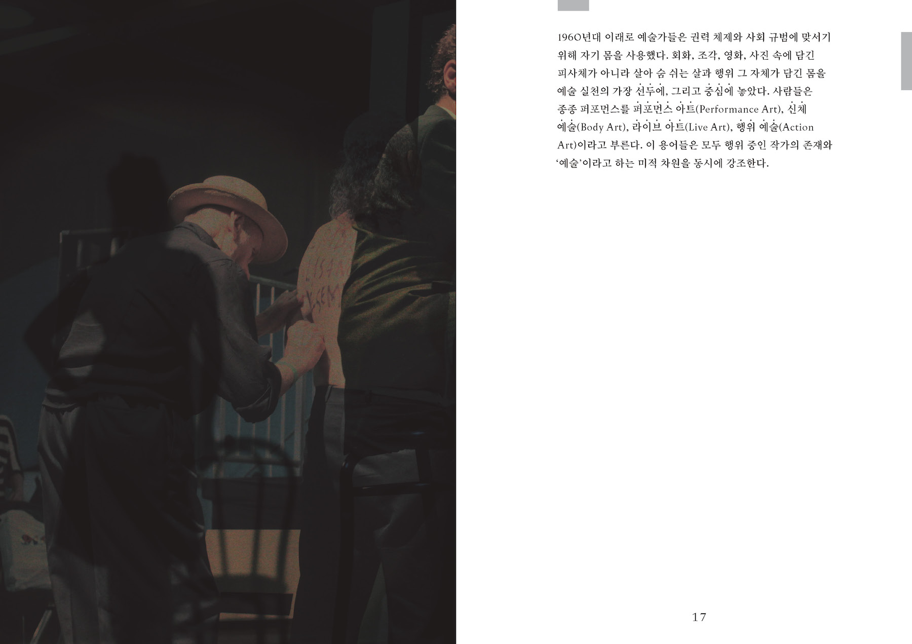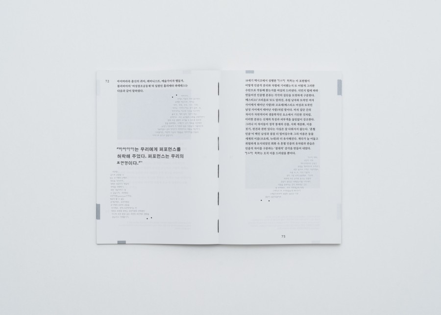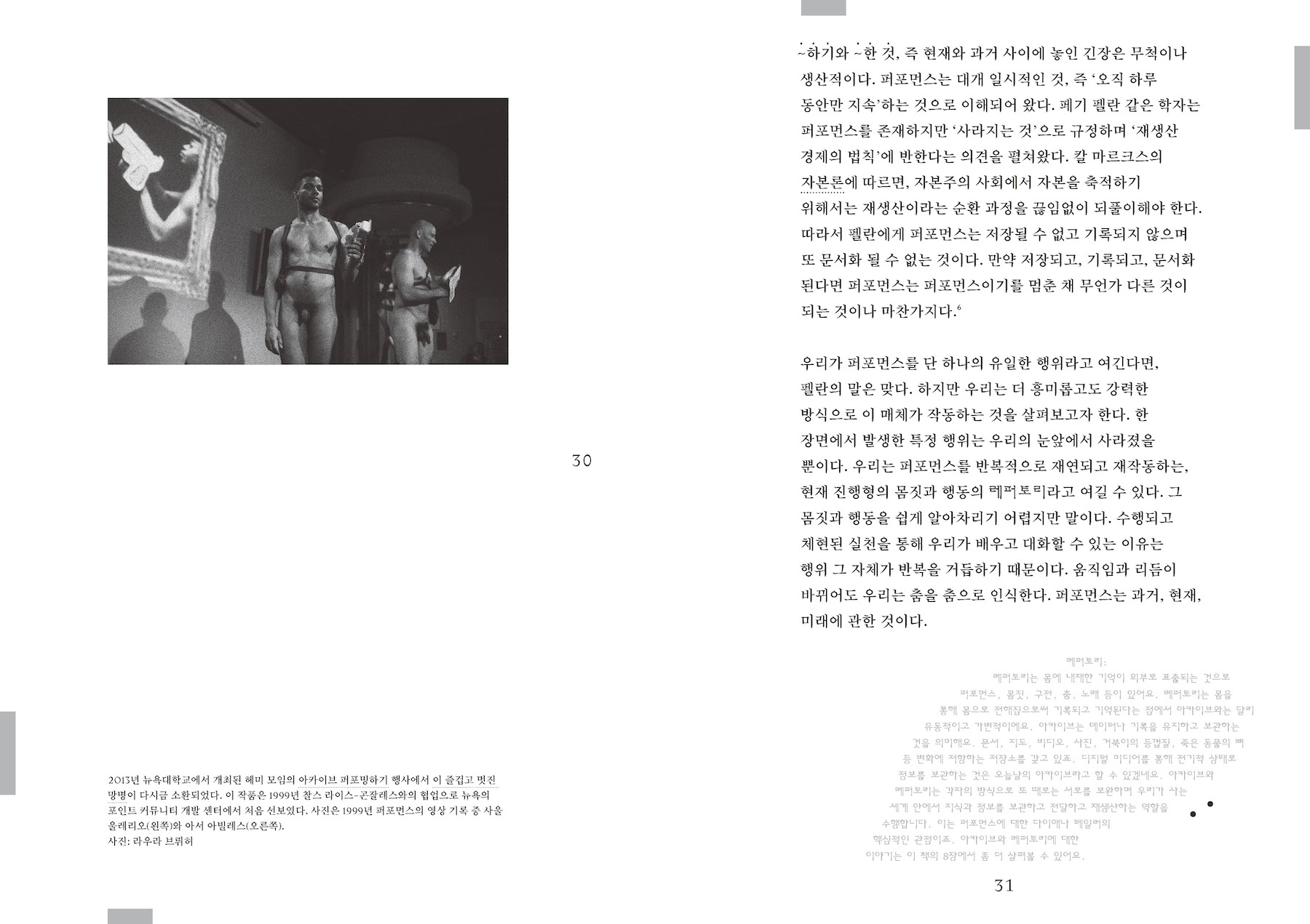 이 책에 등장하는 수많은 작가들과 퍼포먼스 작업이 아메리카, 특히 라틴 아메리카 지역에 집중되어 있는 것은 우연이 아니다. 다이애나 테일러는 1998년 설립된 헤미스퍼릭 인스티튜의 창립자 중 한 명으로, 이 기관은 아메리카 지역의 퍼포먼스를 연구하고 이에 관해 대화하는 급진적인 장소이다. 테일러는 헤미 인스티튜트 아카이브의 자료와 자신의 학자행동가(activist-academics)로서의 활동 경험을 바탕으로 이 책을 썼다. 서로 다른 지리적, 문화적, 정치적, 사회적 조건을 가지고 있으며 서로 다른 언어를 사용하는 이들과의 대화를 통해, 저자는 퍼포먼스가 근본적으로 얼마나 불안정하고 유동적인지를, 그리고 동시에 경계과 구분을 넘어서는 힘을 가지고 있는지를 이론화하게 된 것이다. 이 책이 우리에게 알려 주는 것은 아메리카라는 대상이 아니다. 그보다는 특정 지역의 사회와 문화가 어떻게 그 현실적 조건을 수용하고 또 비판하며 퍼포먼스를 수행하는가 이다. 여기에는 어떤 지역과 장소의 정체성은 퍼포먼스에 의해, 그러니까 끊임없이 움직이고 흐르는 행동들로 구성되고 재구성된다는 것이 전제되어 있을 것이다. 이는 자연스럽게, 그렇다면 우리를 둘러싼 현실적 조건은 무엇이며 우리는 여기서 무엇을 수행해야 하고 할 수 있는지를 묻게 한다.