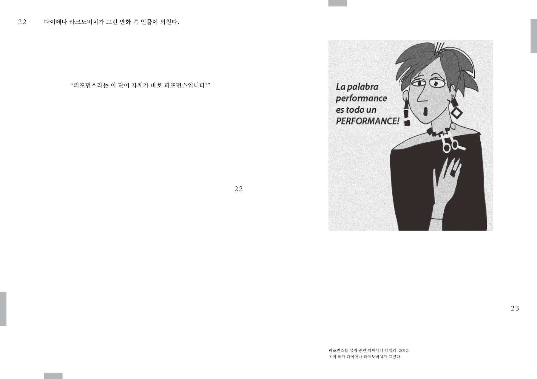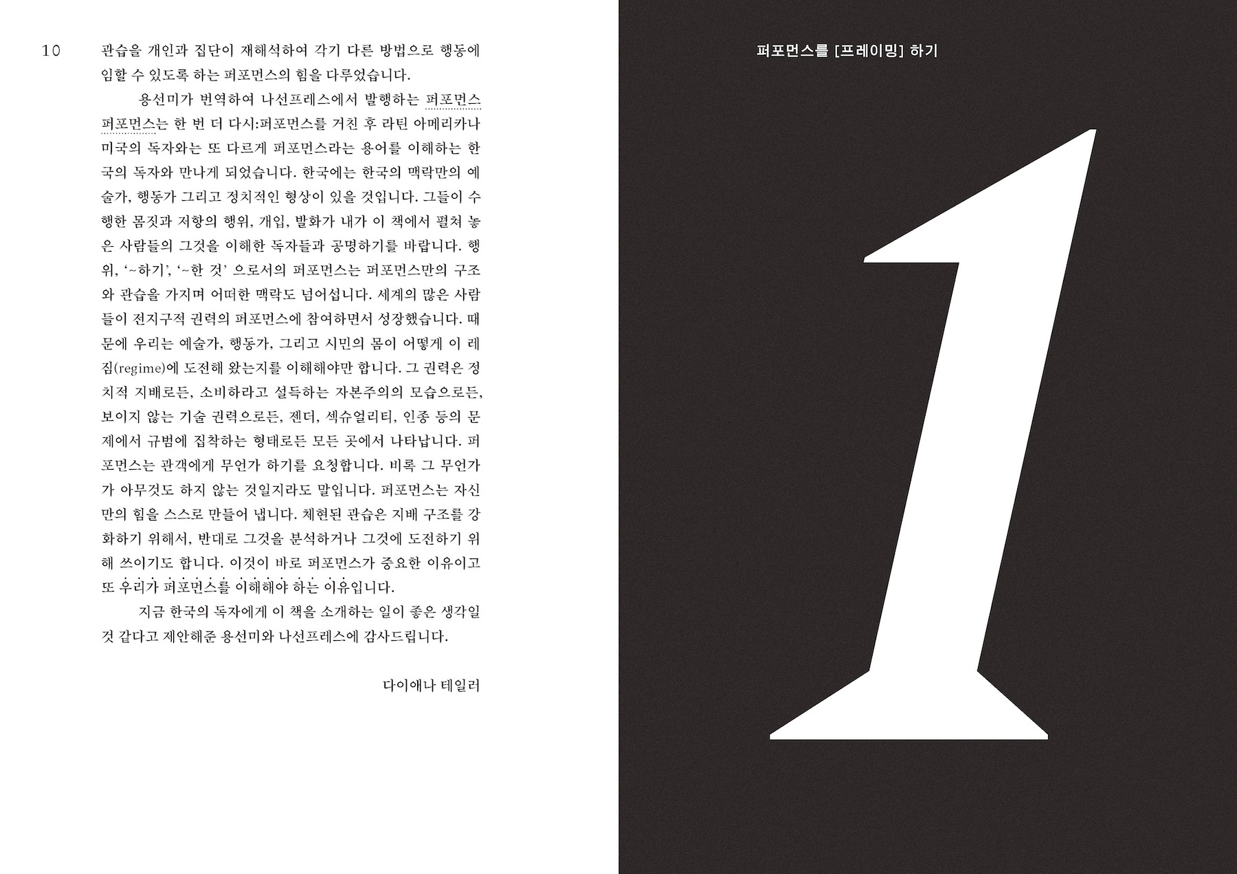 테일러는 이미 연구서 『아카이브와 레퍼토리: 아메리카 지역에서의 문화적 기억의 수행』(2003)을 통해 아메리카 지역의 문화와 사회를 구성함에 있어서 퍼포먼스가 어떠한 중요한 역할을 했는지를 논의한 바 있다. 『퍼포먼스 퍼포먼스』는 이러한 저자의 평생의 연구와 경험을 간명히 이론화한 정수라고 해도 손색없을 것이다. 세계를 퍼포먼스로서 인지하기를 제안하는 이면에는, 나아가 우리가 보다 능동적이고 주체적으로 움직임을 선택하고 생성해 나가기를 바라는 요청이 있다. 다이애나 테일러에게 퍼포먼스는, 무엇보다도, “세상을 만드는 일”이다.