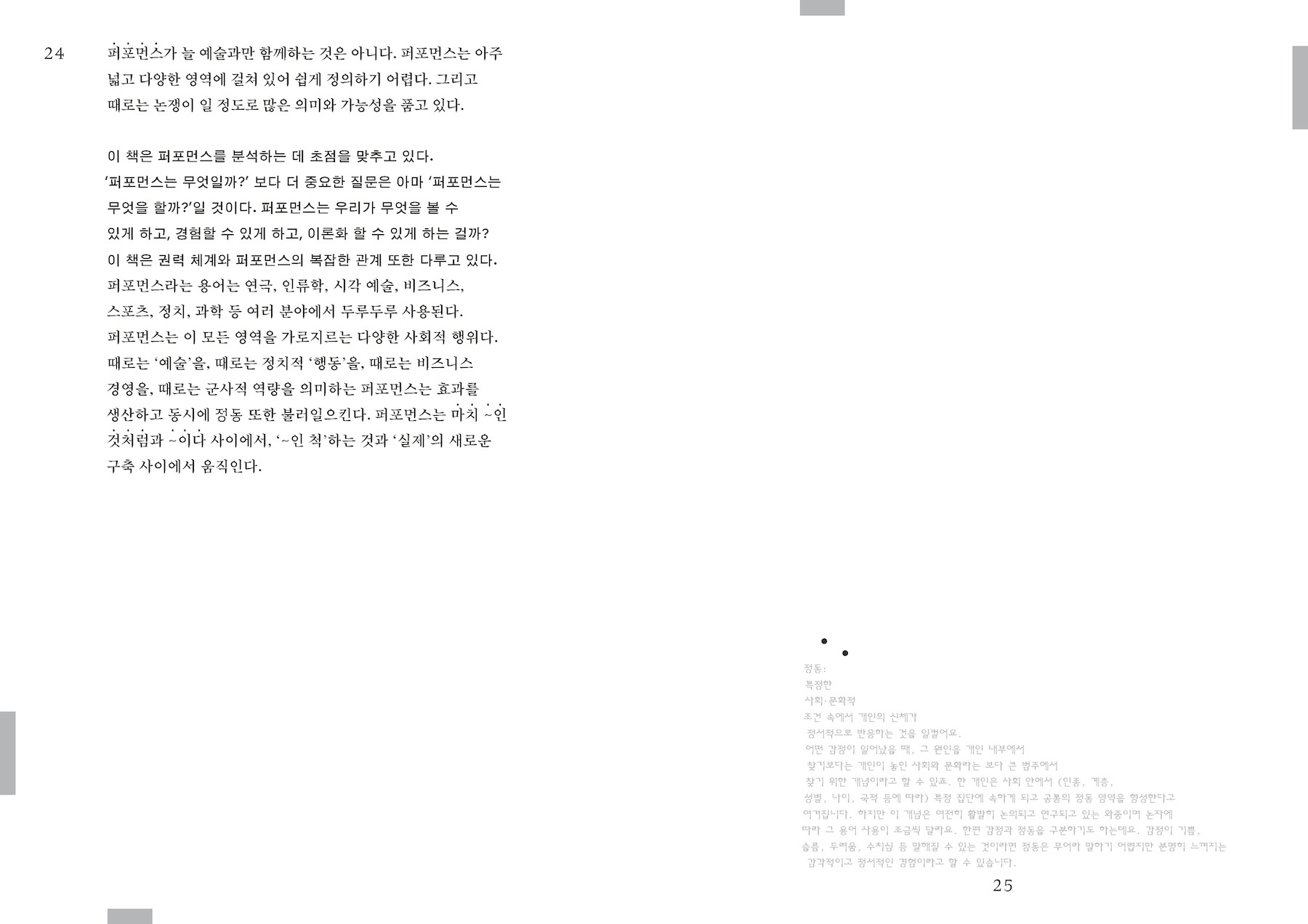 퍼포먼스를 일종의 인식론으로 여기는 저자는 이 책을 통해 퍼포먼스가 그저 무대에서 이루어지는 행위나 현상이 아니라 그것이 얼마나 우리의 삶과 문화, 사회와 정치 안에 깊숙하게 자리잡은 작용인지를 일깨워준다. 즉, 우리가 어떻게 퍼포먼스를 통해서 무언가를 알게 되는지를 알려준다. 퍼포먼스를 통해 인간 문명이 어떻게 형성되어 왔는지를, 그리고 현대 사회를 구성하는 다양한 권력이 어떻게 미시적으로 복잡하게 작동하는지를 광범위하게 통찰하는 이 책을 읽고 나면, 독자는 일상 생활에서 수행하는 사사로운 말과 행동들부터 전지구적 자본주의와 억압적 정치 체제에 이르기까지 세계를 퍼포먼스로서 이해할 수 있을 것이다. 우리를 둘러싼 모든 말과 행위들, 비가시적이지만 엄연한 힘의 작용, 관계의 양태에 대해 비로소 비판적으로 인식할 수 있게 될 것이다. 퍼포먼스는 타자에게 영향을 주고 타자와의 관계를 변화시키는 모든 행위의 총체이며 인식론으로서의 퍼포먼스는 이러한 행위를 발견하고 이해하는 방법이다. 이 인식을 통해 우리는 우리에게 이미 주어진 몸과 몸짓에서 벗어나 다른 몸과 몸짓을 상상하고 수행할 수 있는 가능성을 열 수 있을 것이다. 퍼포먼스 이론의 유용함은 자연스럽고 절대적인 것이라고 받아들이는 관습에 대해 의문을 제기하고, 이에 개입할 수 있는 틈을 발견하도록 한다는 것에 있다.