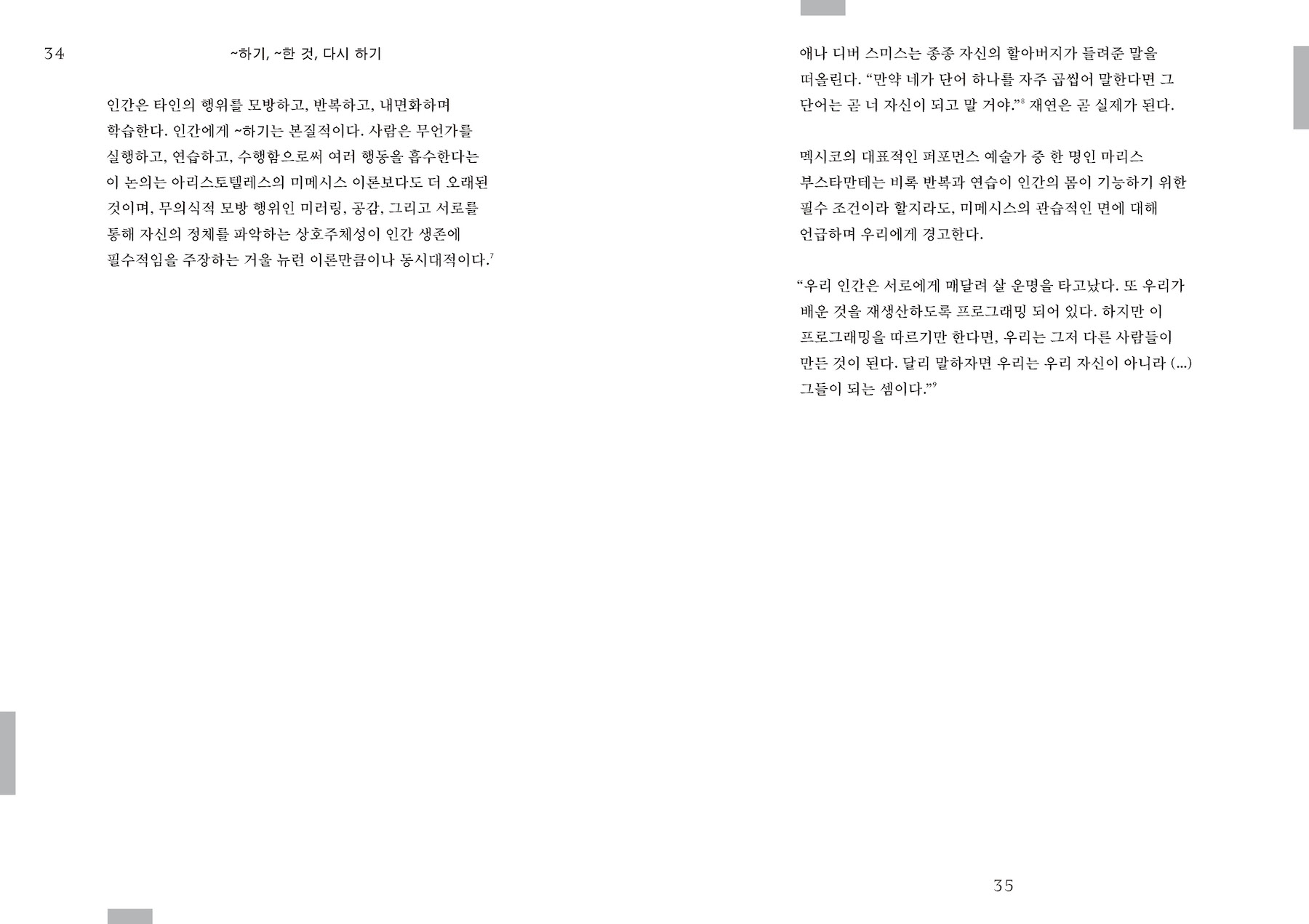 한편, 퍼포먼스가 일시적이고 단명한다는, 그러니까 아주 잠깐 동안만 존재하고 사라지는 매체라고 여기는 통념에서 한 발 벗어나 다이애나 테일러는 퍼포먼스가 무한히 반복되며 끊임없이 변화하는 삶을 살아간다고 말한다. 아니 오히려 반복의 가능성을 통해서만 퍼포먼스는 퍼포먼스가 된다. ‘반복된 행위’가 바로 퍼포먼스이며, 인류는 이 반복된 퍼포먼스를 통해 무언가를 배우고, 전수하고, 공동체를 구성해 왔다는 것이다. 반복은 다이애나 테일러의 퍼포먼스 이론의 핵심이며, 주체를 형성하고 구성하는 중요한 수행성이다. 반복된 행위를 관찰한다면 우리는 우리에 대해서 더 많은 것을 알 수 있다. 다이애나 테일러는 퍼포먼스의 반복이 어떻게 한 사회의 기억과 문화를 여러 세대에 걸쳐서 전승하는지를 ‘레퍼토리’라는 개념을 통해 설명한다. 재현과 인쇄 문화가 오늘날 우리의 앎을 구축하는 가장 강한 이데올로기 장치라면, 퍼포먼스는 그와는 다른 앎의 생성 체계다. 여기서 테일러가 강조하는 것은 비판적 반복이다. 즉 그저 주어진 것을 다시 반복할 것이 아니라, 그것을 보다 적극적인 변화의 도구로서 이용하자는 것이다. “퍼포먼스의 퍼포먼스”. 알아채지 못하더라도 우리는 언제나 어떤 퍼포먼스에 참여하고 있음을 이해하고 새로운 퍼포먼스를 상상할 때에만 기존의 세계는 변한다.