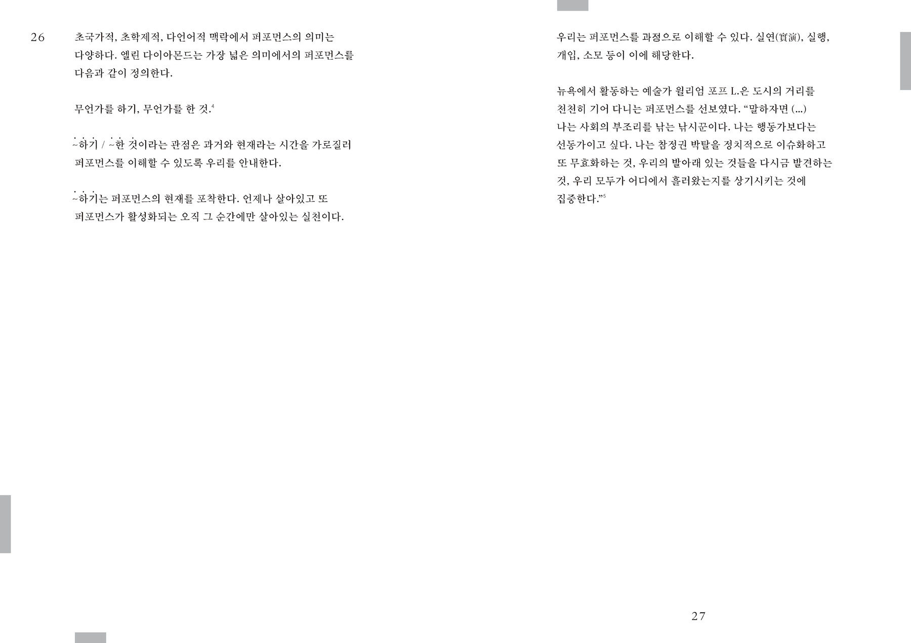 『퍼포먼스 퍼포먼스』는 또한 퍼포먼스의 독특한 존재론에 대해서도 다룬다. 테일러가 말하는 퍼포먼스는 가시적인 행위나 발화에만 한정되지 않는다. 퍼포먼스는 언제나 상황과 맥락, 테일러의 표현을 빌자면 ‘프레임’에 따라 그 의미와 효과가 변화한다. 때문에 테일러에게 퍼포먼스란 행위를 둘러싼 가시적이고 비가시적인 상황의 총체성을 뜻한다. 은밀하게 수행되고 실현되는 폭력의 과정과 그것이 가능한 조건을 가시화하고 이에 저항하는 과테말라의 퍼포먼스 작가 레지나 호세 갈린도를 이 책의 7장에서 중요하게 논의하는 이유이기도 하다. 행위를 둘러싼 상호 작용 시스템의 총체성으로까지 확장하여 퍼포먼스를 사유할 때, 비로소 퍼포먼스라는 존재 방식의 실체가 드러난다. 달리 말하면, 퍼포먼스의 존재론을 이해하는 과정은 비가시적인 움직임과 그 작용 전체를 인지하는 일이기도 한 것이다.