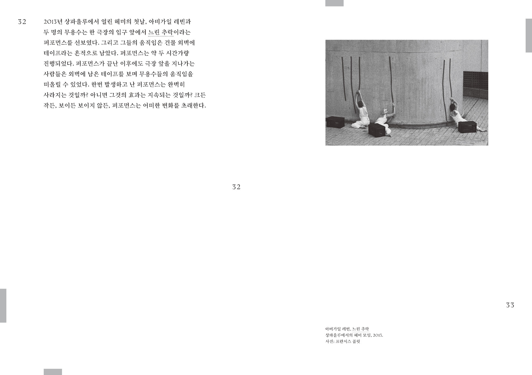 유행하는 ‘무슨무슨 챌린지’를 따라 춘 춤을 영상으로 찍어 SNS에 올림으로써 만들어지는 네트워크가 있는가 하면, 미얀마의 여성들은 군부 쿠데타에 저항하며 군인들이 침입하지 못하도록 여자들이 입는 옷을 빨랫줄에 걸어 두었다. 천천히 주변을 돌아보면, 우리가 사는 세상은 온갖 퍼포먼스로 가득하고 우리는 그것 속에서 살아간다는 것을 발견하게 된다. 우리는 왜 퍼포먼스 하고, 퍼포먼스를 통해 무엇을 하는 것일까? 혹은, 퍼포먼스는 우리가 무엇을 하도록 할까? 다이애나 테일러의 『퍼포먼스 퍼포먼스』는 그 어느 때보다도 퍼포먼스로 가득한, 그리고 그 어느 때보다도 퍼포먼스가 강한 힘을 발휘하고 있는(다른 한편으로는 동시에 퍼포먼스가 완전히 잊히고 있는) 오늘날 우리가 세계의 한 부분을 이해하는 데 도움을 주는 도구적 이론서이다. 세계를 퍼포먼스로서 바라보면, 전혀 다른 풍경이 펼쳐진다.